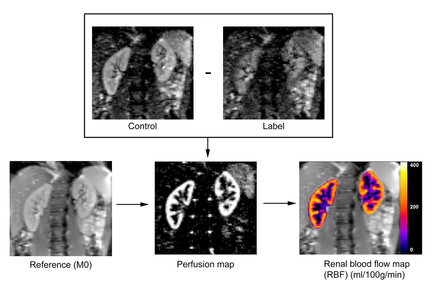 Figure 1. Arterial Spin Labeling (ASL) overview in which control and label images are acquired. A difference image is obtained for each control-label pair. Multiple ASL pairs are averaged to obtain the mean perfusion map. Renal blood flow (ml/min/100g) is calculated by applying a mathematical model to the mean perfusion image and to the reference image (M0).