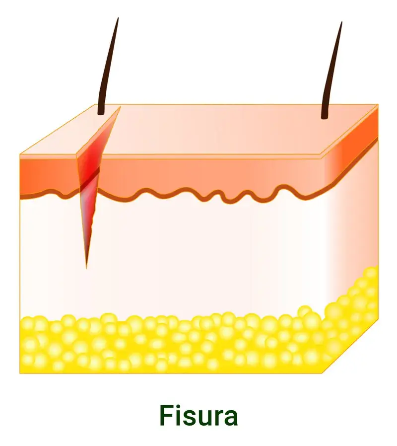 Son grietas o cortes lineales que pueden ser bastante profundas, afectando no solo la epidermis sino también las capas más profundas de la piel. Las fisuras a menudo se encuentran en zonas de la piel que están frecuentemente expuestas a movimientos y, por lo tanto, a tensión, como las manos, los pies o las comisuras de los labios.