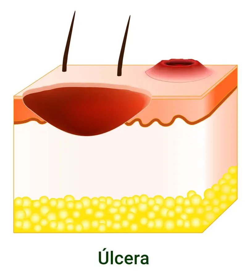 Representan una pérdida de sustancia más grave que las fisuras o las erosiones. Las úlceras penetran a través de la epidermis y pueden llegar hasta la dermis, el tejido subcutáneo, o incluso más profundo hasta los músculos. A menudo son crónicas y pueden ser causadas por una variedad de factores, incluyendo presión constante (como las úlceras por presión), circulación sanguínea deficiente o enfermedades subyacentes, como la diabetes. El tratamiento de las úlceras es complejo y puede requerir la intervención de un equipo multidisciplinario de profesionales de la salud para abordar tanto la curación de la úlcera como sus causas subyacentes.