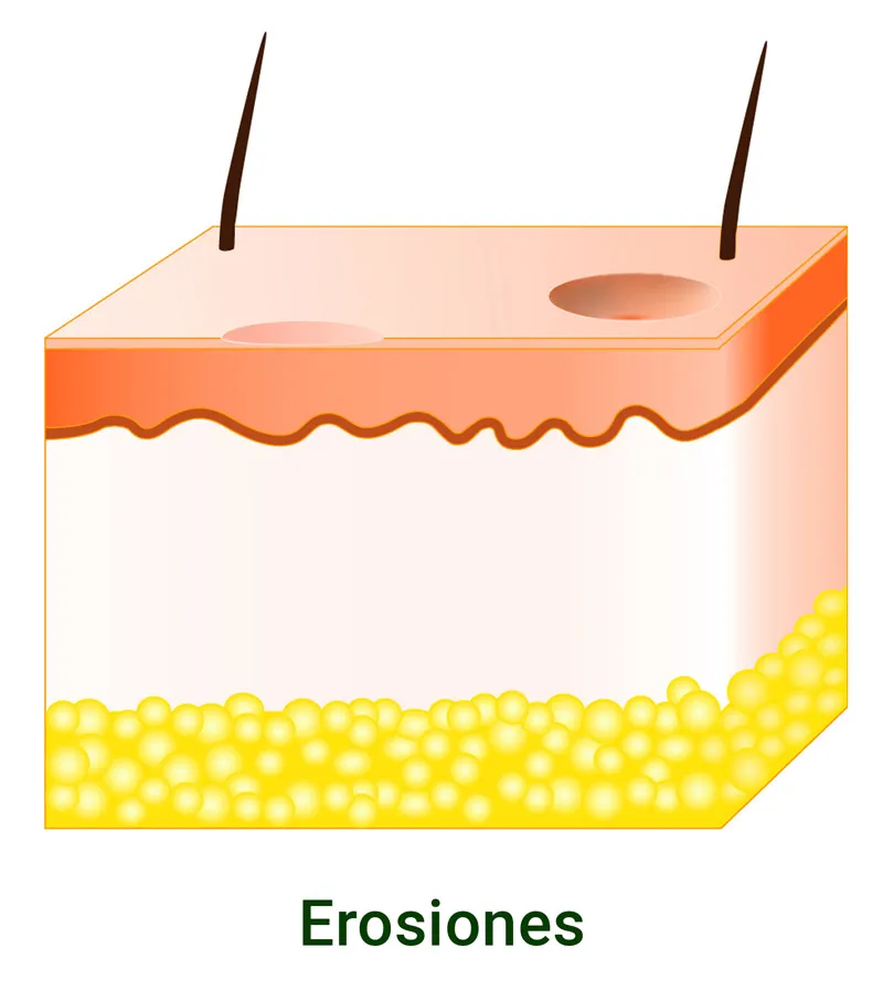 Esta lesión implica una pérdida superficial de la piel, que generalmente no afecta más allá de la epidermis. Las erosiones son comunes y suelen ser el resultado de un traumatismo, como rascarse intensamente.