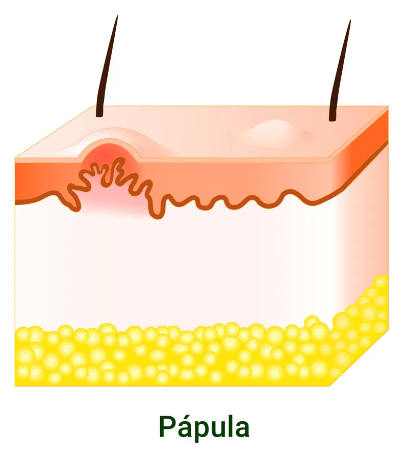 Es una elevación sólida y palpable de la piel que mide menos de un centímetro de diámetro. A diferencia de las ronchas, las pápulas son de consistencia más firme y tampoco dejan cicatriz al resolverse.