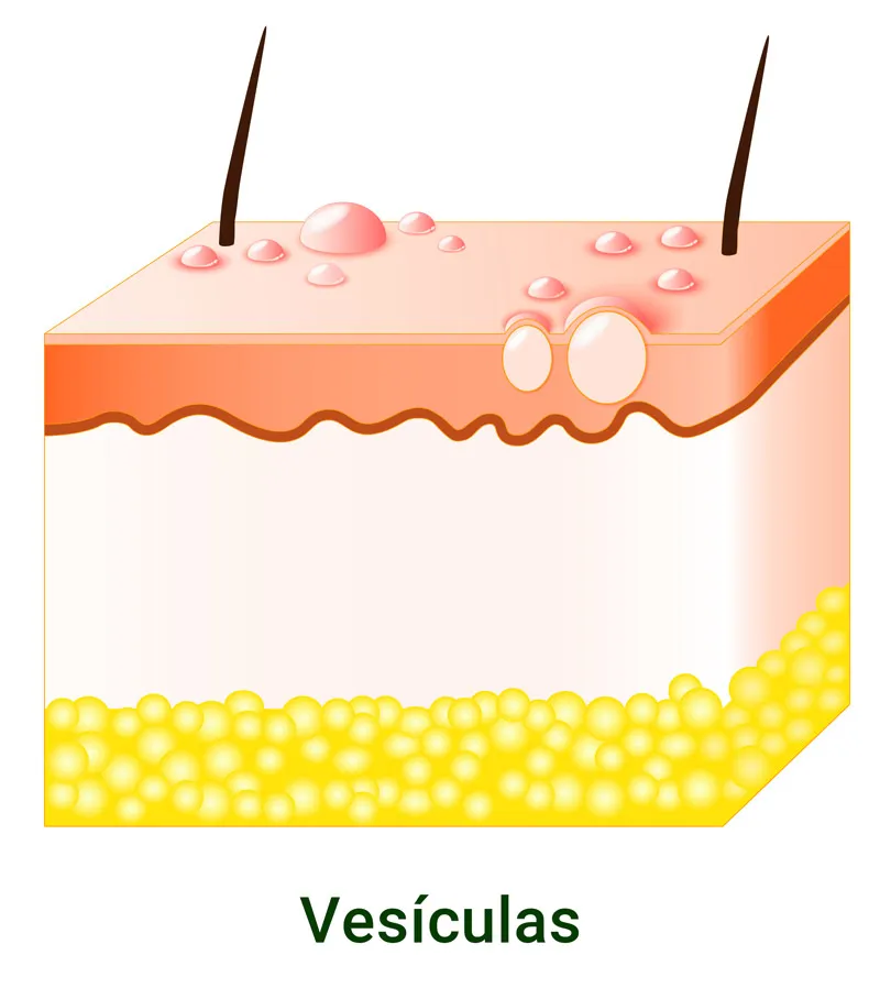 Es una elevación circunscrita y pequeña de la piel que contiene líquido claro en su interior. Con un diámetro generalmente menor a 5 milímetros, estas lesiones pueden ser resultado de inflamaciones, infecciones virales, como el herpes, o reacciones alérgicas.