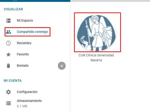 4.- Para poder visualizar los datos que se han compartido con usted, es necesario seleccionar la opción Compartido conmigo, donde se visualiza el icono CUN Clínica Universidad de Navarra que debemos seleccionar y dar doble clic.
